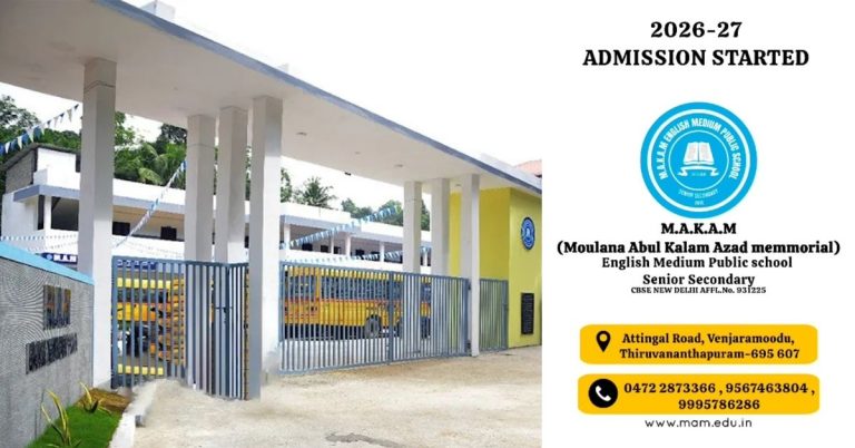 വെഞ്ഞാറമൂടിലെ എം.എ.കെ.എ.എം സീനിയർ സെക്കന്ററി പബ്ലിക് സ്കൂളിൽ 2026–27 അധ്യയന വർഷത്തേക്കുള്ള പ്രവേശനം ആരംഭിച്ചു March 6, 2026 Read More »