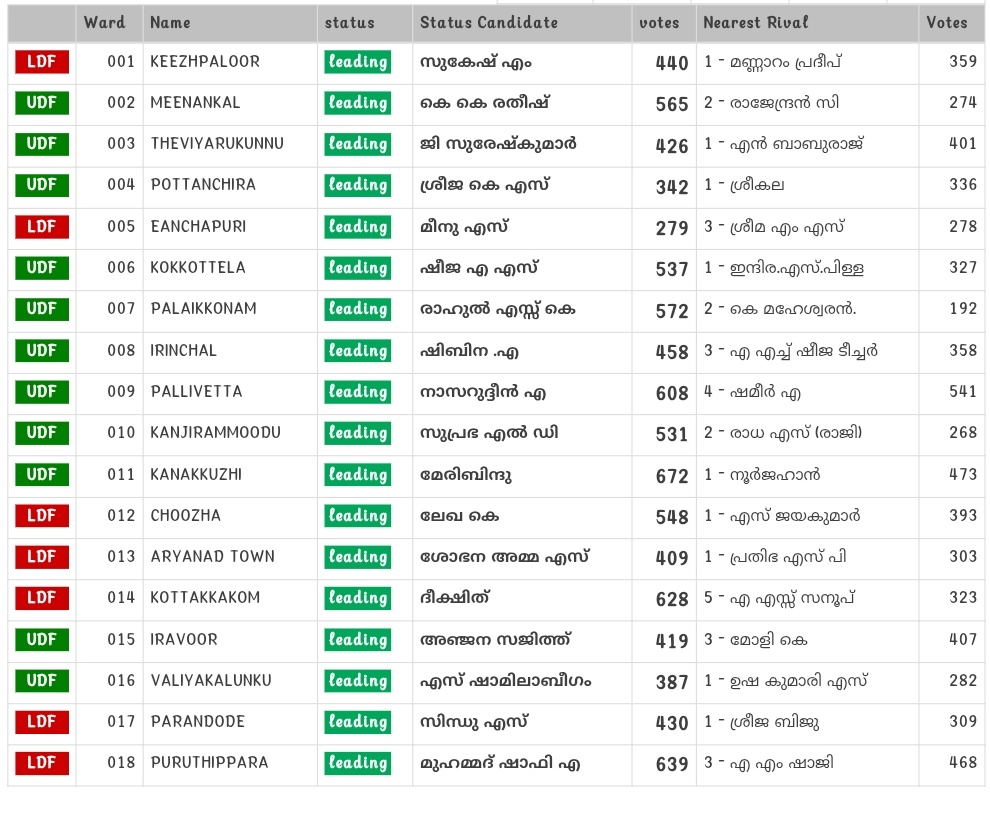 ആര്യനാട് : ആര്യനാട് ഗ്രാമപഞ്ചായത്തിൽ 11 വാർഡുകളിൽ വിജയിച്ച് യു ഡി എഫ് ഭൂരിപക്ഷം നേടി. ആകെ 18 വാർഡിൽ 7 വാർഡുകളിൽ എൽ ഡി എഫും വിജയിച്ചു