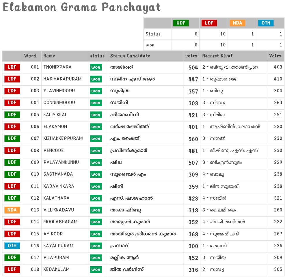 ഇലകമൺ : ഇലകമൺ ഗ്രാമപഞ്ചായത്തിൽ 10 വാർഡുകളിൽ വിജയിച്ച് എൽ ഡി എഫ് ഭൂരിപക്ഷം നേടി. ആകെ 18 വാർഡിൽ 6 വാർഡുകളിൽ യു ഡി എഫും ഒരു വാർഡിൽ ബിജെപിയും ഒരു വാർഡിൽ സ്വതന്ത്ര സ്ഥാനാർഥിയും വിജയിച്ചു.