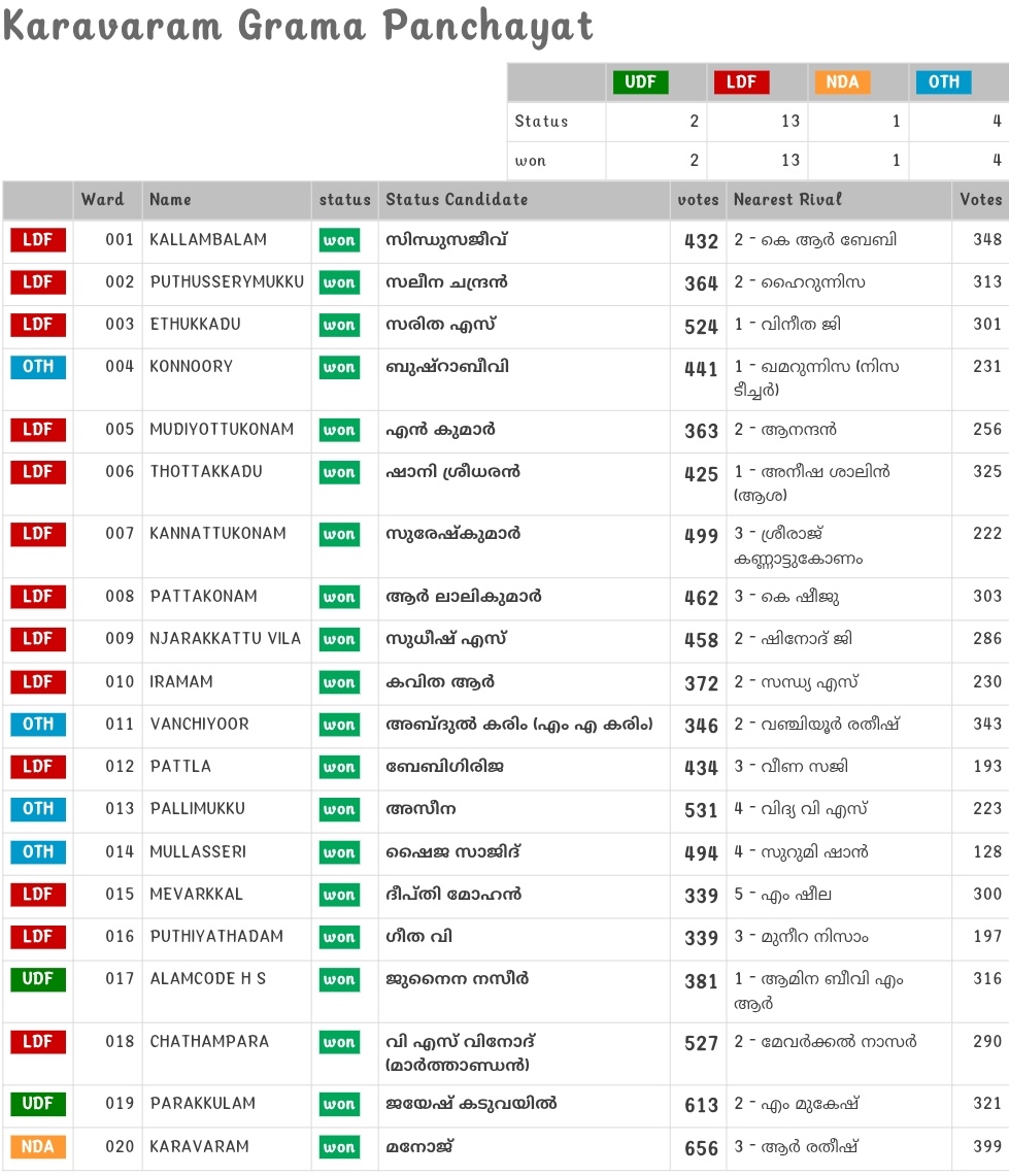 കരവാരം : കരവാരം ഗ്രാമപഞ്ചായത്തിൽ 13 വാർഡുകളിൽ വിജയിച്ച് എൽ ഡി എഫ് ഭൂരിപക്ഷം നേടി. ആകെ 20വാർഡിൽ 4 വാർഡുകളിൽ എസ്ഡിപിഐ യും 2 വാർഡിൽ യുഡിഎഫും ഒരു വാർഡിൽ ബിജെപിയും വിജയിച്ചു
