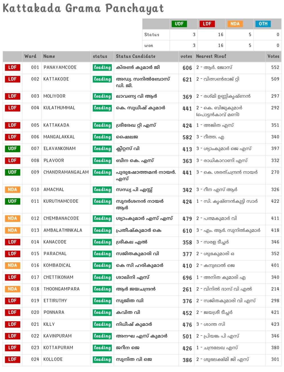 കാട്ടാക്കട : കാട്ടാക്കട ഗ്രാമപഞ്ചായത്തിൽ 16 വാർഡുകളിൽ വിജയിച്ച് എൽ ഡി എഫ് ഭൂരിപക്ഷം നേടി. ആകെ 24വാർഡിൽ 4 വാർഡുകളിൽ ബിജെപിയും 4 വാർഡിൽ യുഡിഎഫും വിജയിച്ചു