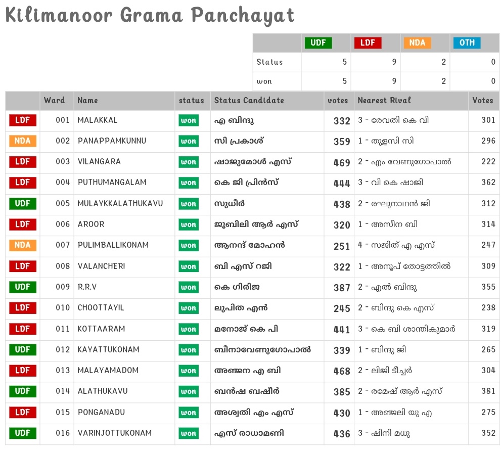 കിളിമാനൂർ : കിളിമാനൂർ ഗ്രാമപഞ്ചായത്തിൽ 9 വാർഡുകളിൽ വിജയിച്ച് എൽ ഡി എഫ് ഭൂരിപക്ഷം നേടി. ആകെ 16വാർഡിൽ 5 വാർഡിൽ യുഡിഎഫും 2 വാർഡുകളിൽ ബിജെപിയും വിജയിച്ചു