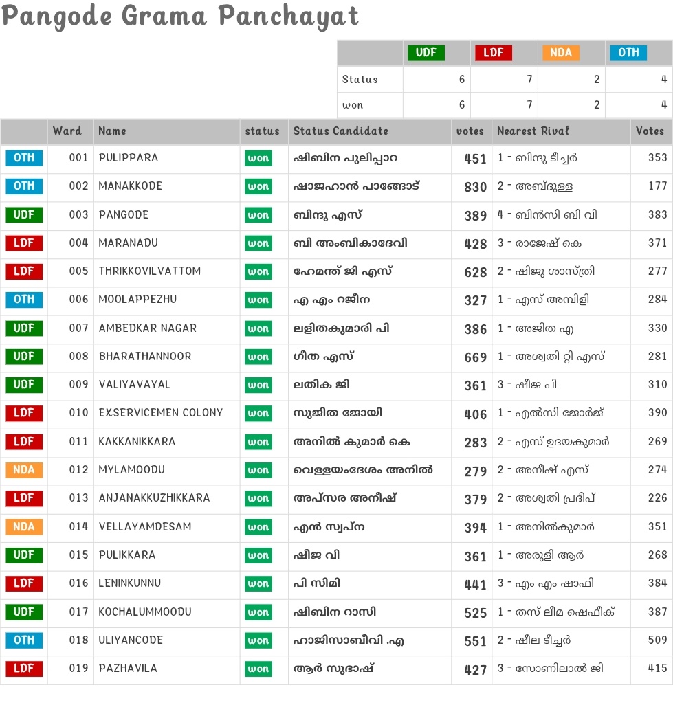 പാങ്ങോട്: പാങ്ങോട് പഞ്ചായത്തിൽ ആകെ 19 വാർഡുകളിൽ 7 വാർഡുകളിൽ എൽ ഡി എഫും 6 വാർഡുകൾ യു ഡി എഫും 4 വാർഡുകൾ സ്വതന്ത്ര സ്ഥാനാർഥികളും ഒരു വാർഡ് ബിജെപിയും നേടി. സ്വതന്ത്ര സ്ഥാനാർഥികളുടെ നിലപാട് ഭരണകക്ഷിയെ തിരഞ്ഞെടുക്കുന്നതിന് കാരണമായേക്കാം.