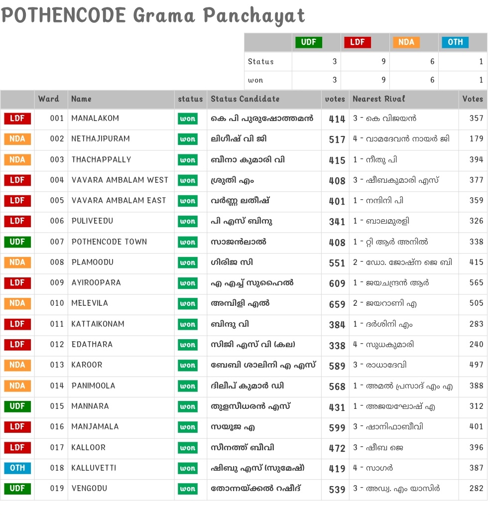 പോത്തൻകോട് : ആകെ 19 വാർഡുകൾ ഉള്ള പോത്തൻകോട് ഗ്രാമ പഞ്ചായത്തിൽ 9 വാർഡുകളിൽ എൽ ഡി എഫും 6 വാർഡുകളിൽ ബിജെപിയും മൂന്ന് വാർഡുകളിൽ യു ഡി എഫും ഒരു വാർഡിൽ സ്വതന്ത്ര സ്ഥാനാർഥിയും വിജയിച്ചു