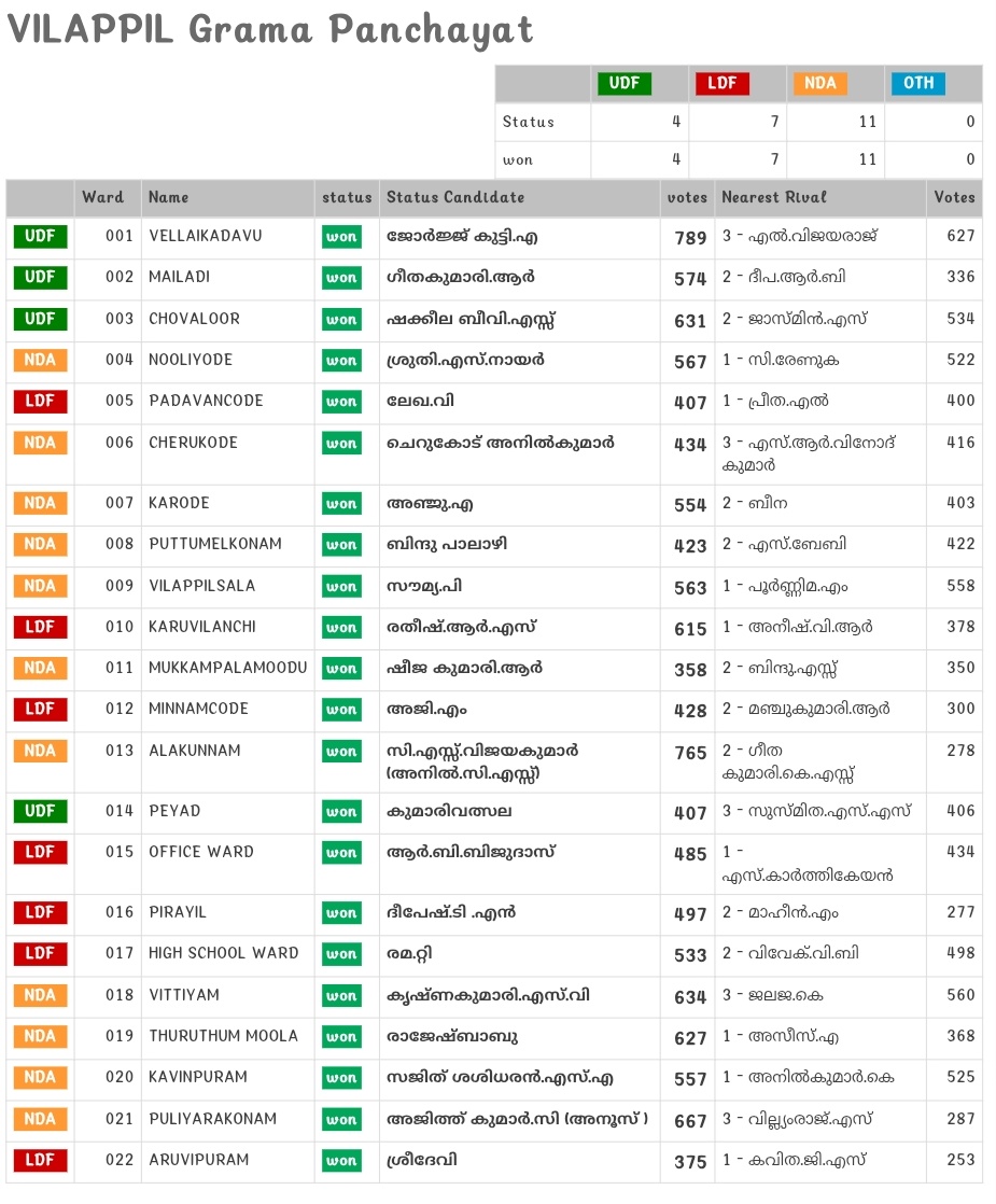 വിളപ്പിൽ: ആകെ 22 വാർഡുകൾ ഉള്ള വിളപ്പിൽ ഗ്രാമ പഞ്ചായത്തിൽ 11 വാർഡുകളിൽ വിജയിച്ച് ബിജെപിക്ക് നല്ല ഭൂരിപക്ഷം. 7 വാർഡുകളിൽ എൽ ഡി എഫും 4 വാർഡുകളിൽ യു ഡി എഫും വിജയിച്ചു