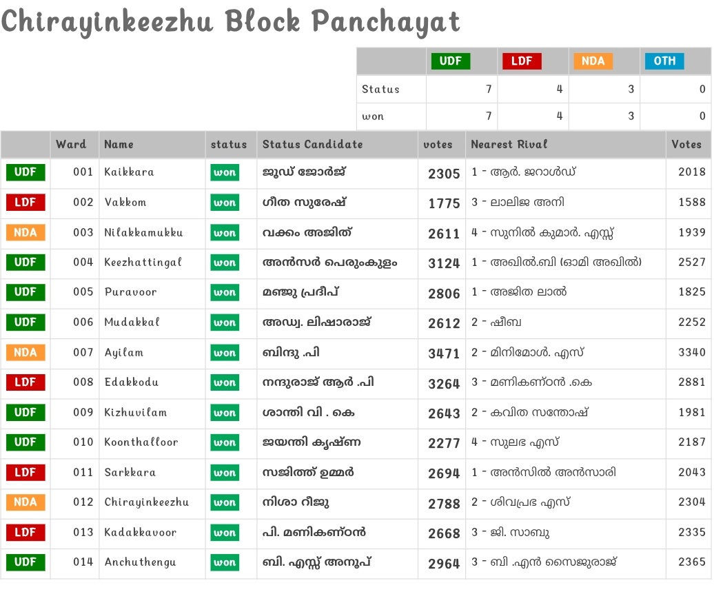 ചിറയിൻകീഴ് : ചിറയിൻകീഴ് ബ്ലോക്ക് പഞ്ചായത്തിൽ 7 ഡിവിഷനിൽ വിജയിച്ച് യുഡിഎഫിന് ഭൂരിപക്ഷം. ആകെ 14 ഡിവിഷനിൽ 4 ഡിവിഷനിൽ എൽഡിഎഫും 3 ഡിവിഷനിൽ ബിജെപിയും വിജയിച്ചു.