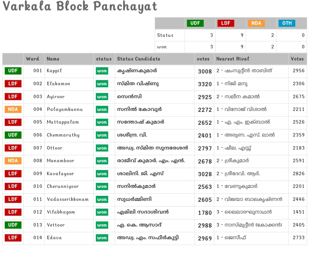 വർക്കല: വർക്കല ബ്ലോക്ക് പഞ്ചായത്തിൽ 9 ഡിവിഷനിൽ വിജയിച്ച് എൽഡിഎഫിനു ഭൂരിപക്ഷം.ആകെ 14 ഡിവിഷനിൽ 3 ഡിവിഷനിൽ യുഡിഎഫും 2 ഡിവിഷനിൽ ബിജെപിയും വിജയിച്ചു.