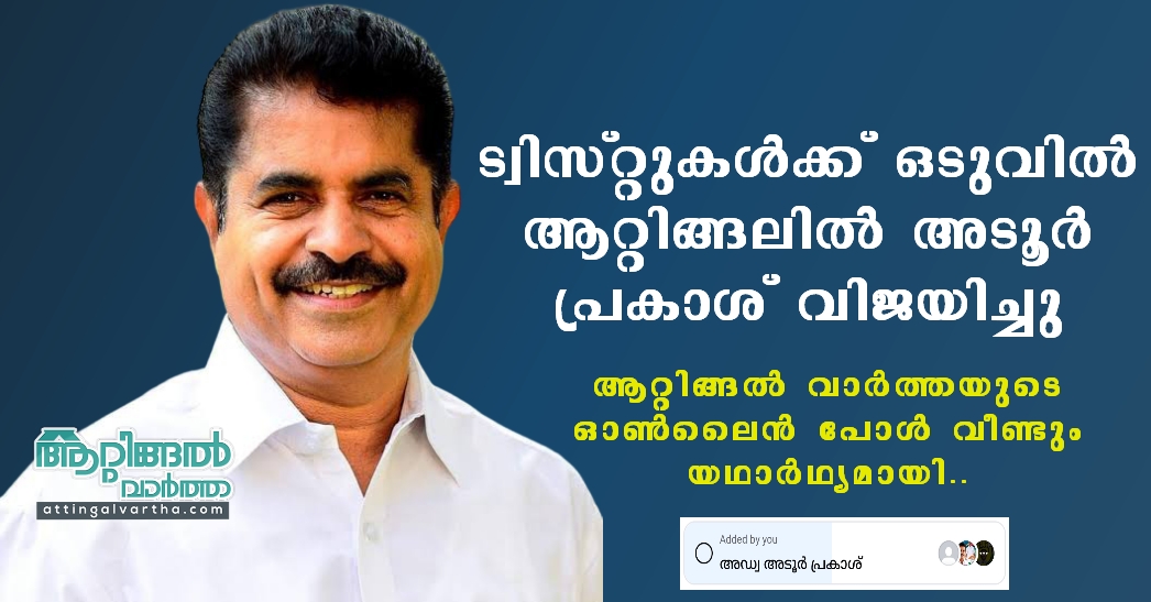 ആറ്റിങ്ങൽ ട്വിസ്റ്റുകൾക്ക് ഒടുവിൽ ആറ്റിങ്ങലിൽ അടൂർ പ്രകാശ് വിജയിച്ചു. ആറ്റിങ്ങൽ വാർത്തയുടെ ഓൺലൈൻ പോൾ വീണ്ടും യാഥാർഥ്യമായി.. Admin YS June 4, 2024 3:09 pm