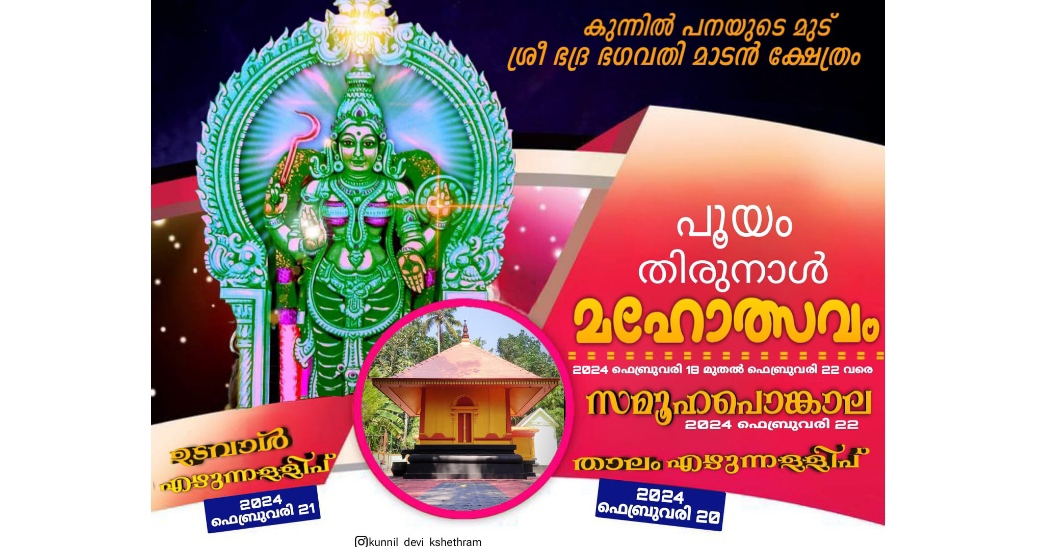 ചിറയിൻകീഴ് കുന്നിൽ പനയുടെമൂട് ശ്രീഭദ്രാ ഭഗവതി മാടൻ ക്ഷേത്രതിൽ പൂയം തിരുന്നാൾ മഹോത്സവം ഫെബ്രുവരി 18 മുതൽ Admin YS February 14, 2024 11:43 am